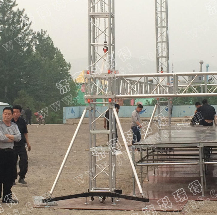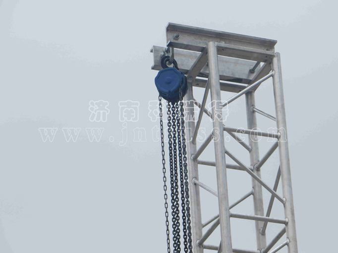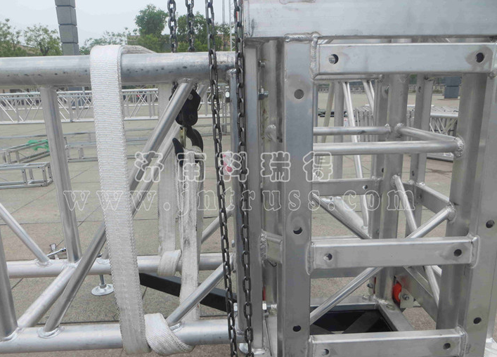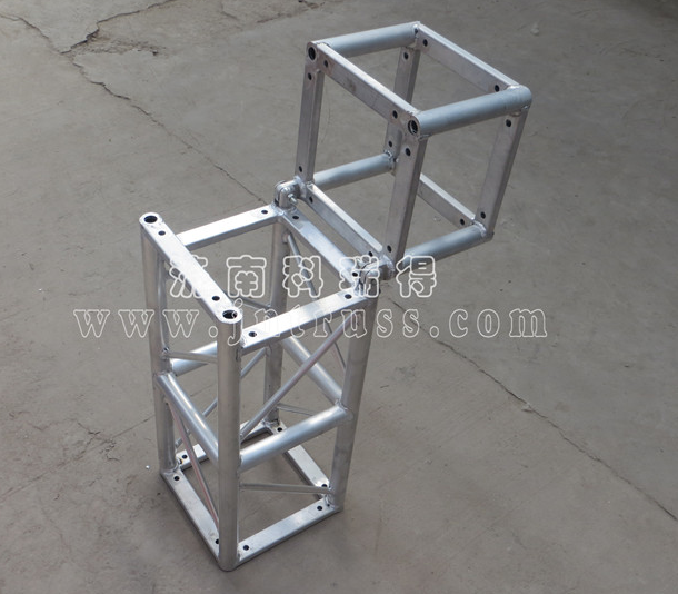 做演出節(jié)目搭建升降鋁合金桁架,可以選用中型,大型規(guī)格桁架。比如:300*300 400*400 450*450 400*600 500*500 500*600 520*760 760*910 等規(guī)格。 最常搭建造型為四根橫梁四根立柱升降燈光桁架。通常由:方套,反頭,橫擔(dān),底座,斜撐,吊帶,吊葫蘆等7七種配件組成。見下圖: